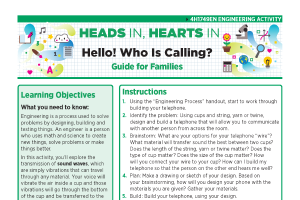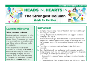 The Heads In, Hearts In family enrichment program encourages families to use their minds as a tool to expand their knowledge around a variety of topic areas. This packet contains all 16 engineering activities.