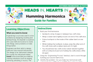 Heads In, Hearts In: A Delivery Approach to Family Enrichment Programming – Engineering Activities are designed to help Michigan State University Extension staff members to involve partners in facilitating a family enrichment program around the topic of engineering education. Family enrichment programming is an approach to education that involves youth and their families learning together as they focus on a topic. This page includes the full engineering activity book containing all 16 science activities, the staff guide for tips for facilitating a family enrichment event and all 16 science activities available for download individually.
