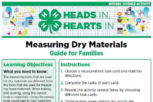 4-H's mission is to empower youth to reach their full potential, working and learning in partnership with caring adults. One goal to achieve that mission is to connect in-school learning with out-of-school-time opportunities that enhance learning. That's precisely the focus of Heads In, Hearts In: A Delivery Approach to Family Enrichment 4-H Programming. These resources encourage youth and families to use their minds (putting their "heads in") as a tool to expand their knowledge around variety of topic areas. By creating a shared educational experience, youth and their families will work, grow and learn together, putting their "hearts in" to the process.