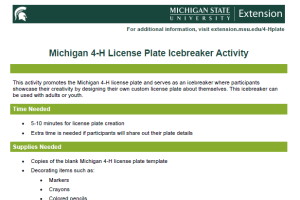 This activity promotes the Michigan 4-H license plate and serves as an icebreaker where participants showcase their creativity by designing their own custom license plate about themselves. This icebreaker can be used with adults or youth. -
