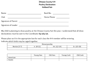 Ottawa County Fair Poultry Declaration 2023. Please send an exhibit tag or index card with your name and class information for each class you plan to enter to the coordinator by the Monday before the fair. Indicate which birds may be caged together.