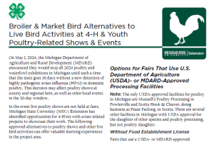 This letter has been created by MSU Extension as a resource to inform livestock auction attendees about the current events surrounding Michigan dairy and poultry sectors and how it is affecting lactating dairy and all poultry exhibitions. -