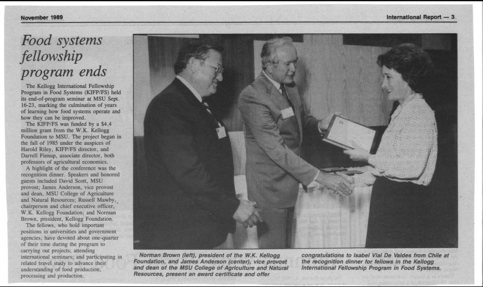 - Final Report to the W. K. Kellogg Foundation on the Kellogg International Fellowship Program in Food Systems (KIFP/FS). 1992. By Riley, Harold M. and Darrell Fienup. [East Lansing] Department of Agricultural Economics, Michigan State University.