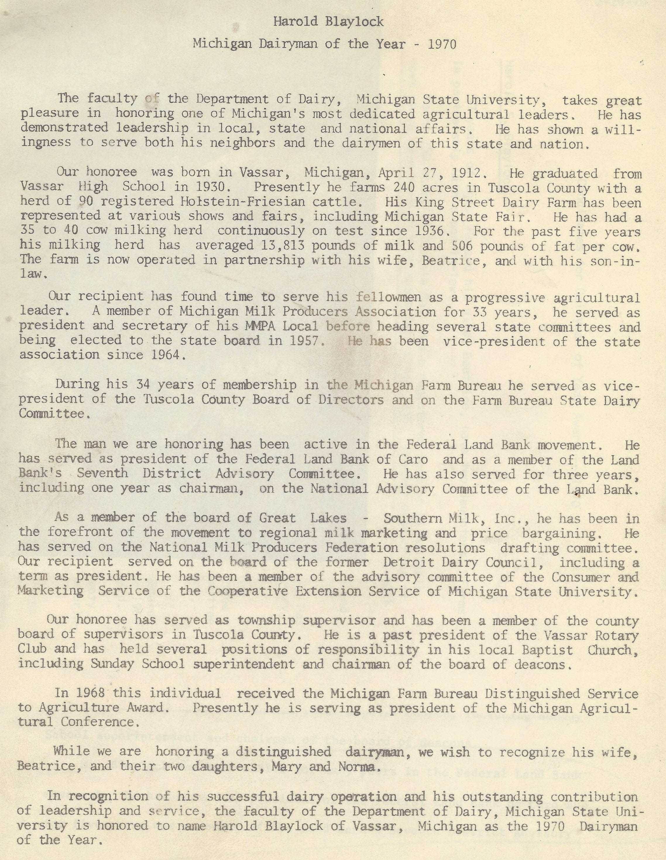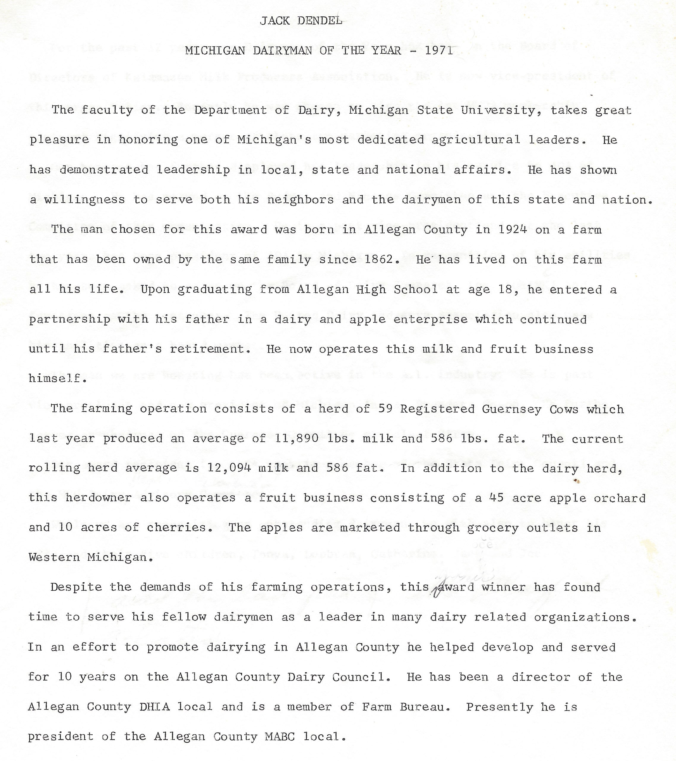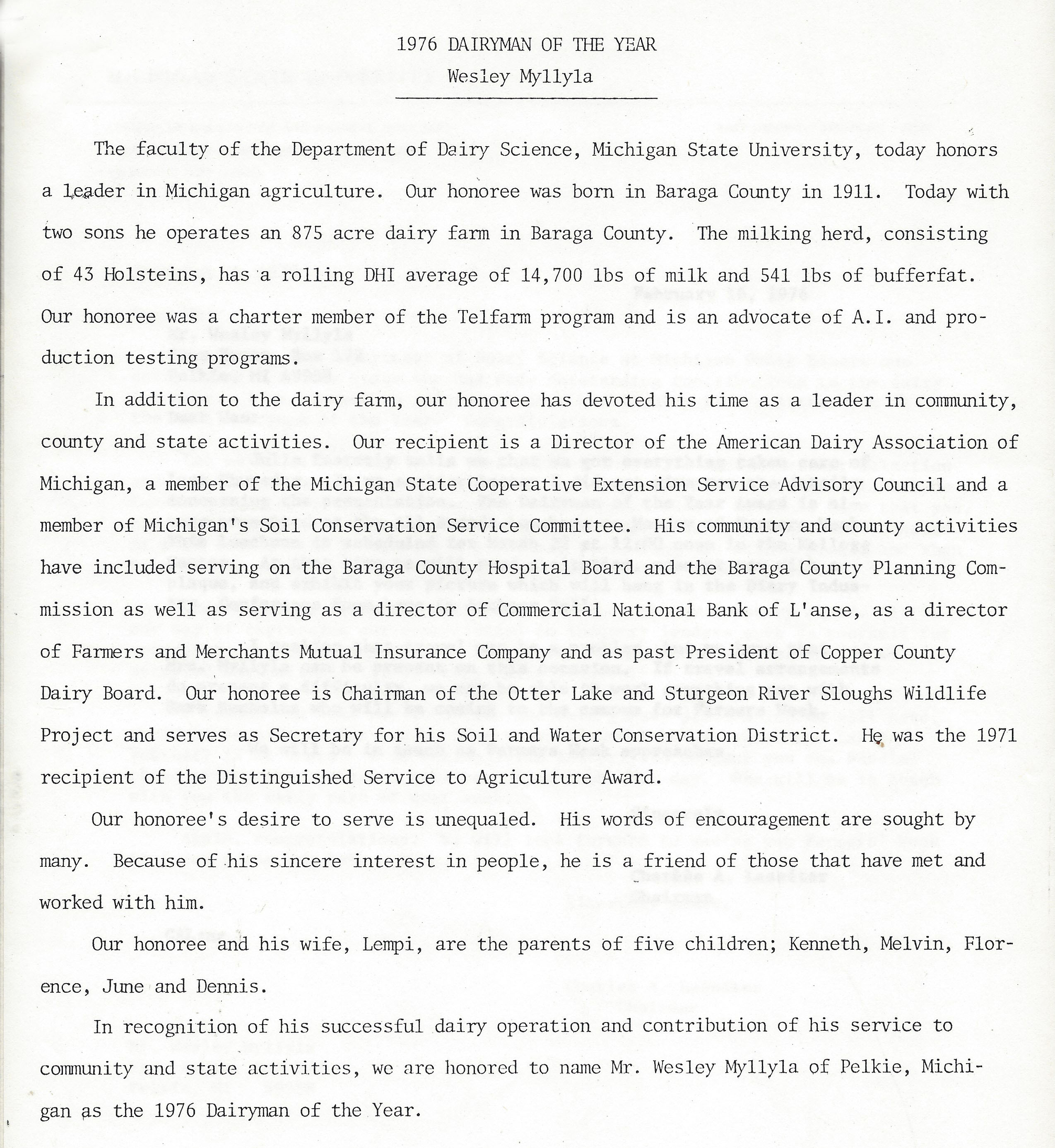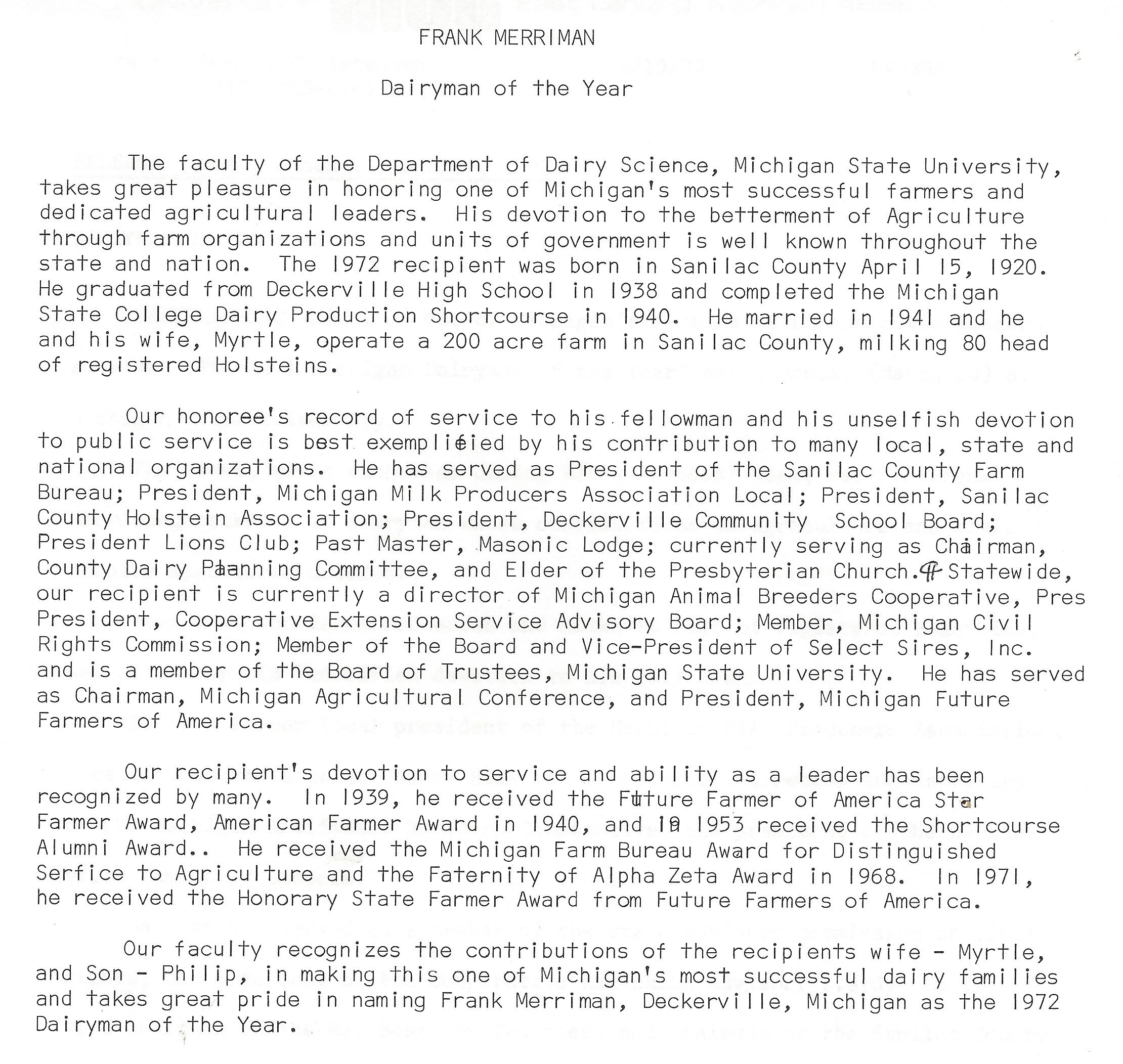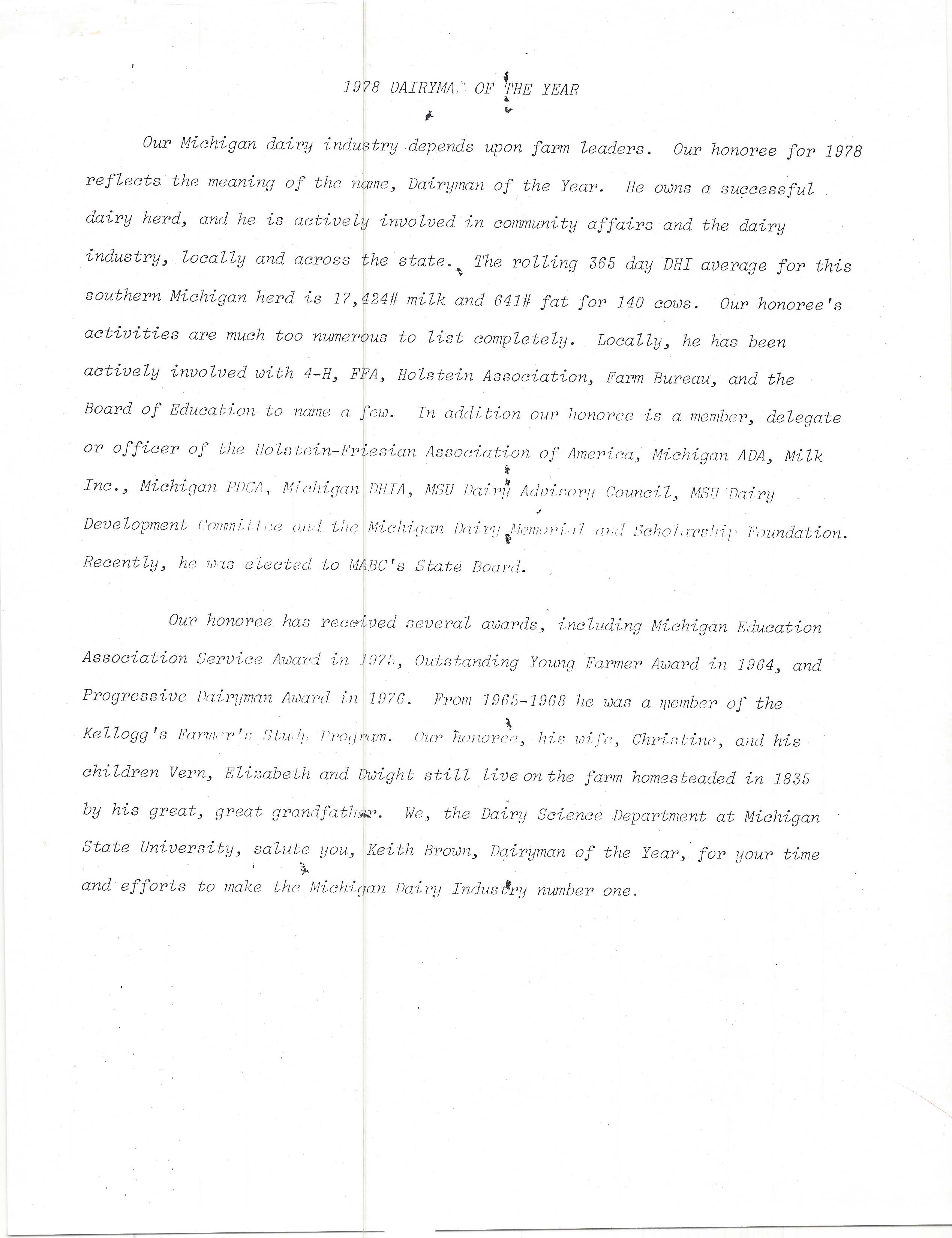 The following Dairy Farmer of the Year descriptions are copies of the letters used in the year of award. At this time, only images of the letters are available.