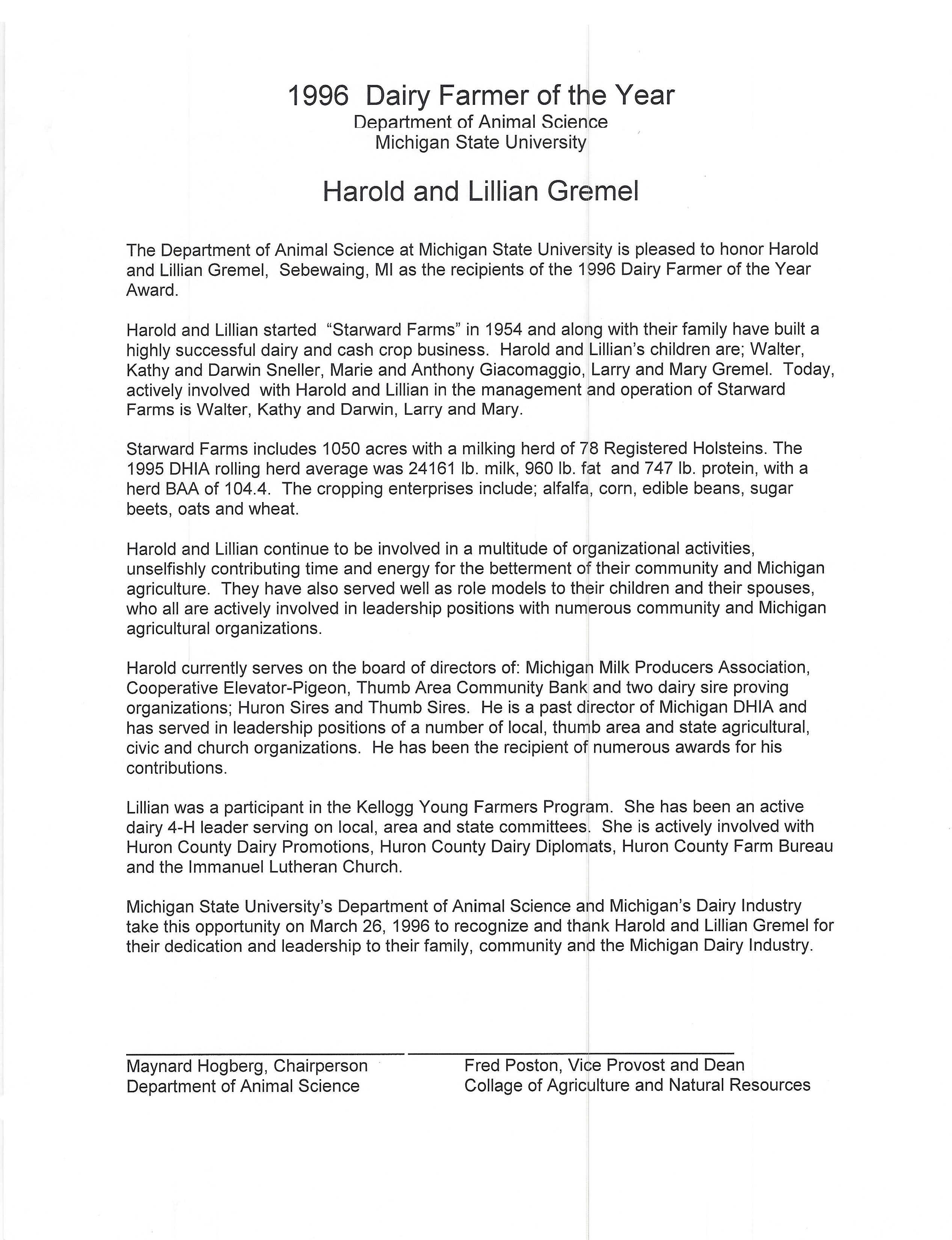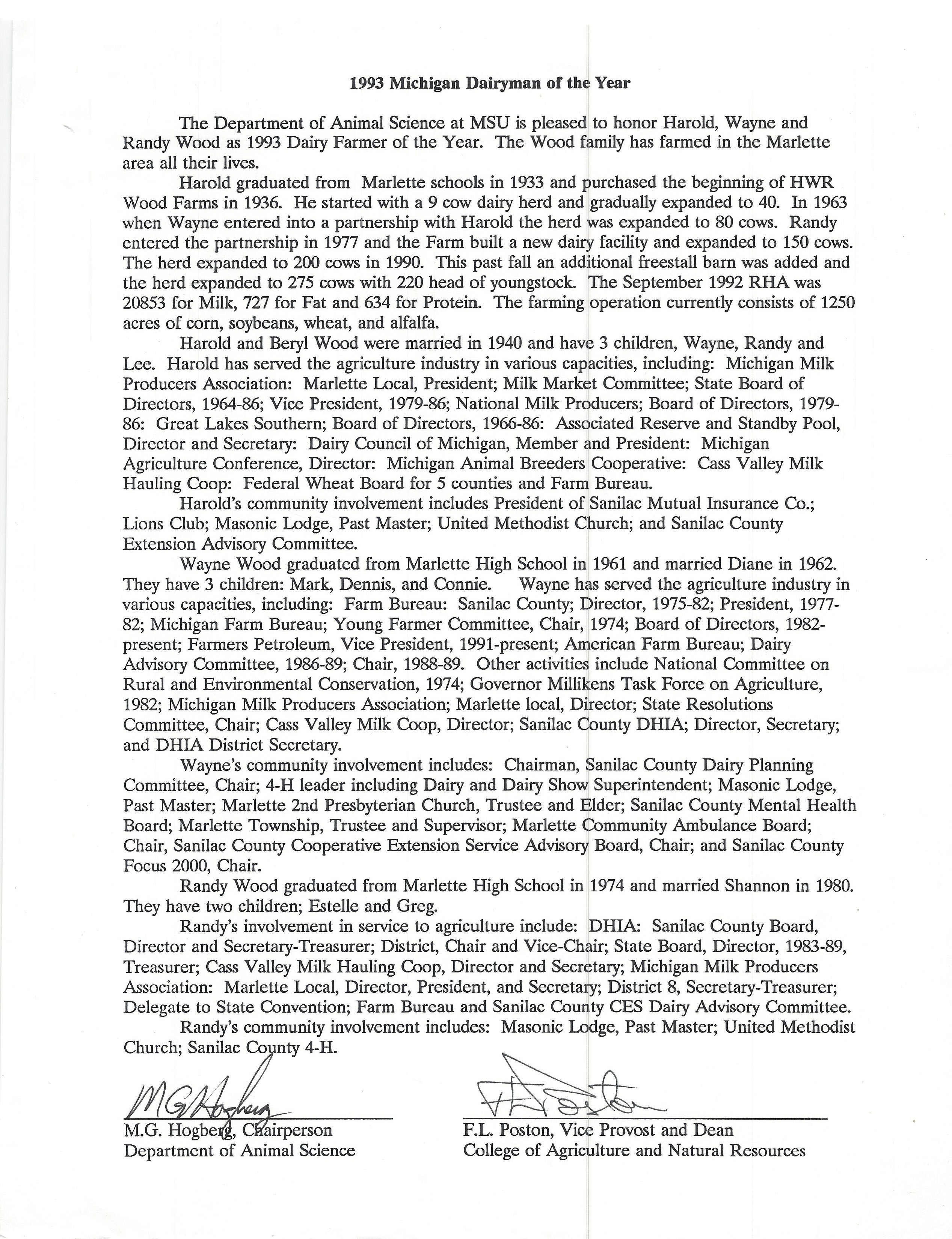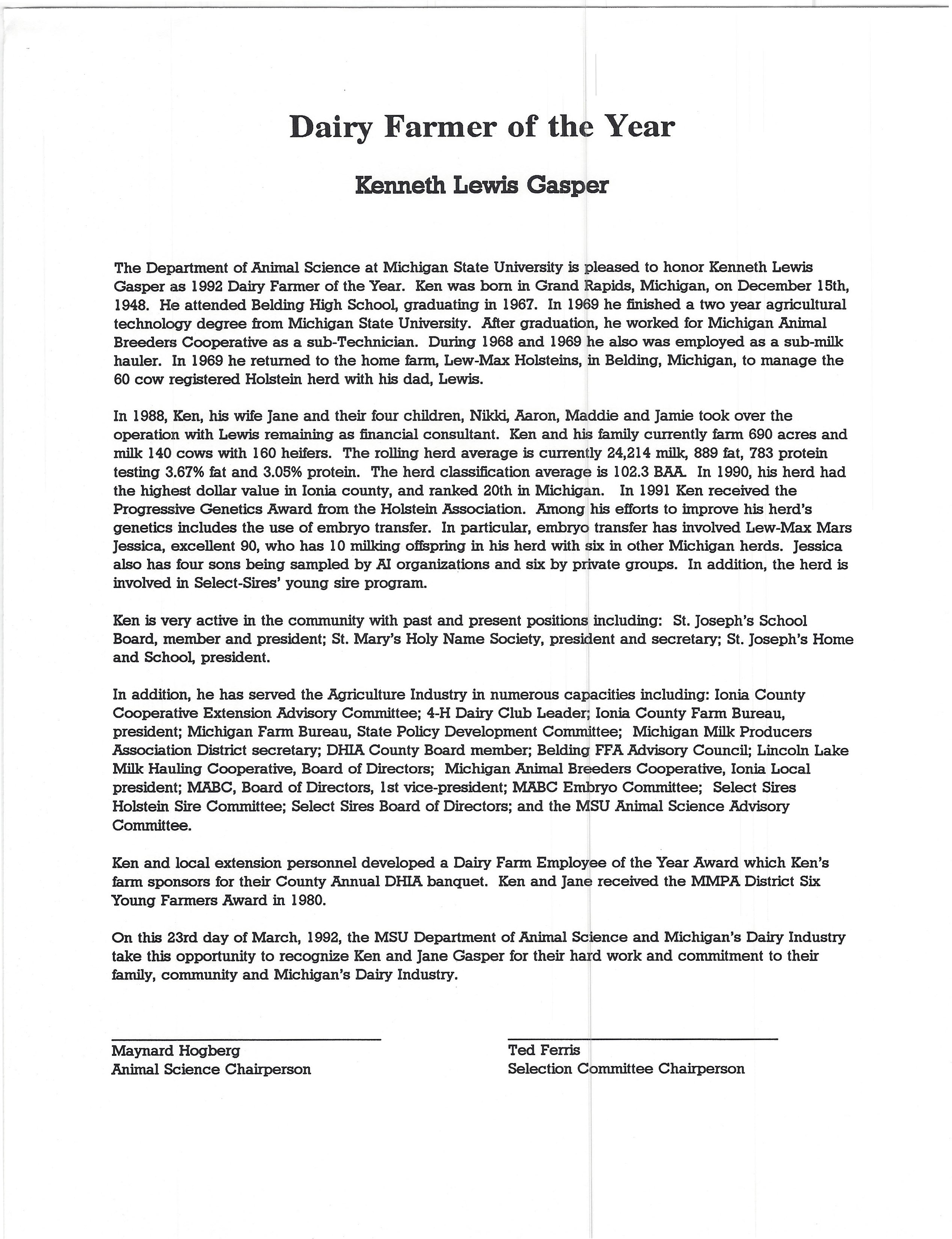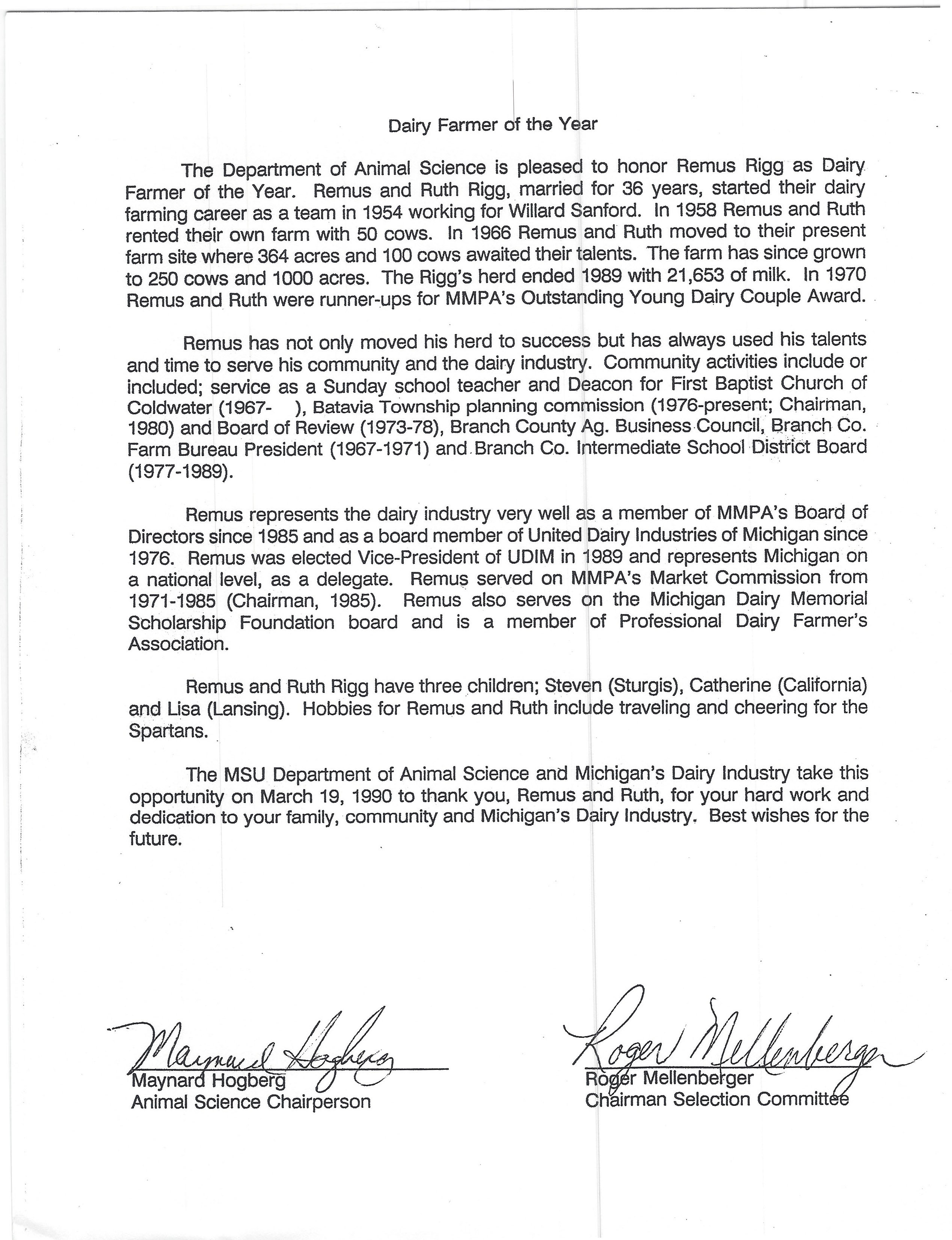 The following Dairy Farmer of the Year descriptions are copies of the letters used in the year of award. At this time, only images of the letters are available.