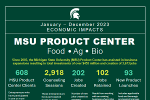 Since 2003, the Michigan State University Product Center has assisted in business expansions resulting in total investments of over $446 million and creation of 3,729 jobs. -