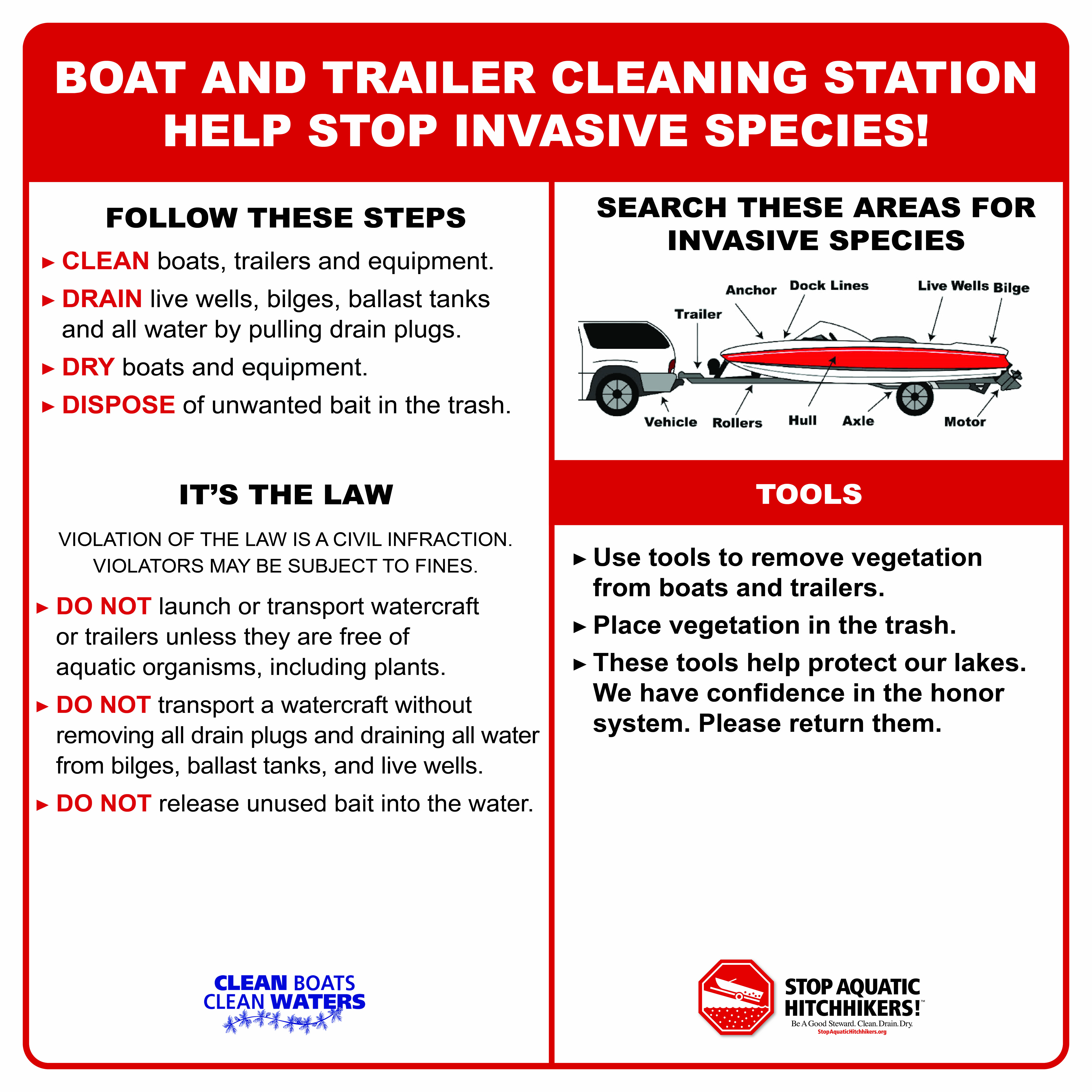 This educational sign includes regulatory information, an illustration of where invasive species are typically found on boats, and space to attach tools such as drain plugs, brushes, plant grabbers, and other decontamination equipment. The sign is 48" X 48" and is typically printed on aluminum or all-weather/UV resistant metal.
