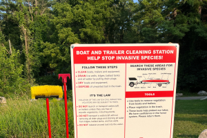 Aquatic invasive species decontamination stations help boaters and anglers know the regulations and aid in cleaning off their boats and gear