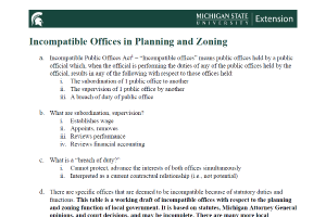 This table is a working draft of incompatible offices with respect to the planning and zoning function of local government. It is based on statutes, Michigan Attorney General opinions, and court decisions, and may be incomplete. -