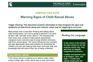 This fact sheet helps parents, volunteers, teachers and other adults who work with or care for children understand the warning signs and symptoms of child sexual abuse. This is part of a series that is designed for parents and adults who work with kids. -