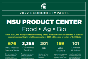 Since 2003, the Michigan State University Product Center has assisted in business expansions resulting in total investments of over $446 million and creation of 3,729 jobs. -