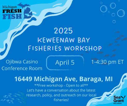 This free workshop is open to all to foster communication within Keweenaw Bay fishing communities of the latest research, policy, and outreach information. Registration is not required.