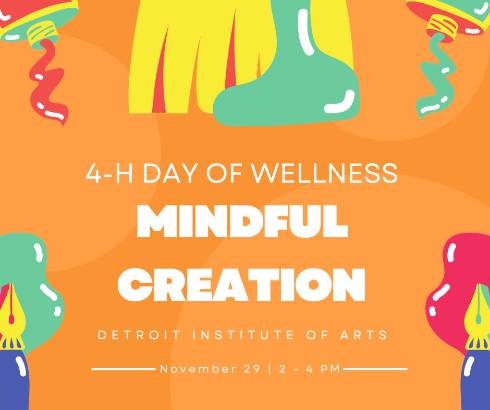 Art can be a powerful tool in mindfulness- join 4-H at the Detroit Institute of Arts to learn more about the connection between our mental wellbeing and creativity! If you are a youth in Wayne, Oakland, or Macomb, come practice your creative skills by making your very own artworks, and get inspired by the wonderful works from artists around the world. Space is limited, register today! (Participants MUST register to participate.)