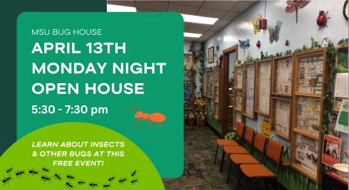 Join us for a free open house at the MSU Bug House on Monday, April 13 from 5:30 to 7:30 pm! Learn about the fascinating world of insects and other arthropods as you observe incredible live and preserved specimens from around the globe! All are welcome at this free event.