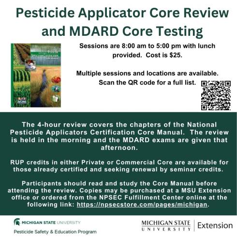 Participants should read and study the Core Manual before attending the review. Copies may be ordered from: https://msupesticidemanuals.com/. Manuals may also be available at your County Extension Office. Call ahead for availability.
