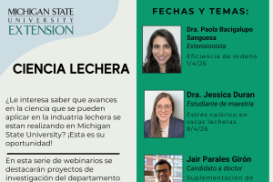 Are you interested in learning about the scientific advances being made at Michigan State University that can be applied to the dairy industry? This is your opportunity! This webinar series will highlight research projects from the Department of Animal Science and Veterinary Medicine and will be presented entirely in Spanish. Participation in the webinars is free, but prior registration is required.