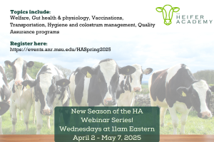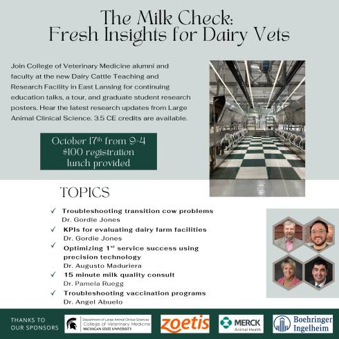 Dr. Gordie Jones and MSU Faculty will share new dairy cattle research and perspectives on October 17th from 9AM to 4 PM. Participate in continuing education talks, a facility tour of the new MSU Dairy, and a graduate student poster session. Registration is $100 and includes lunch. 3.5 CE credits are available. Speakers and topics include: