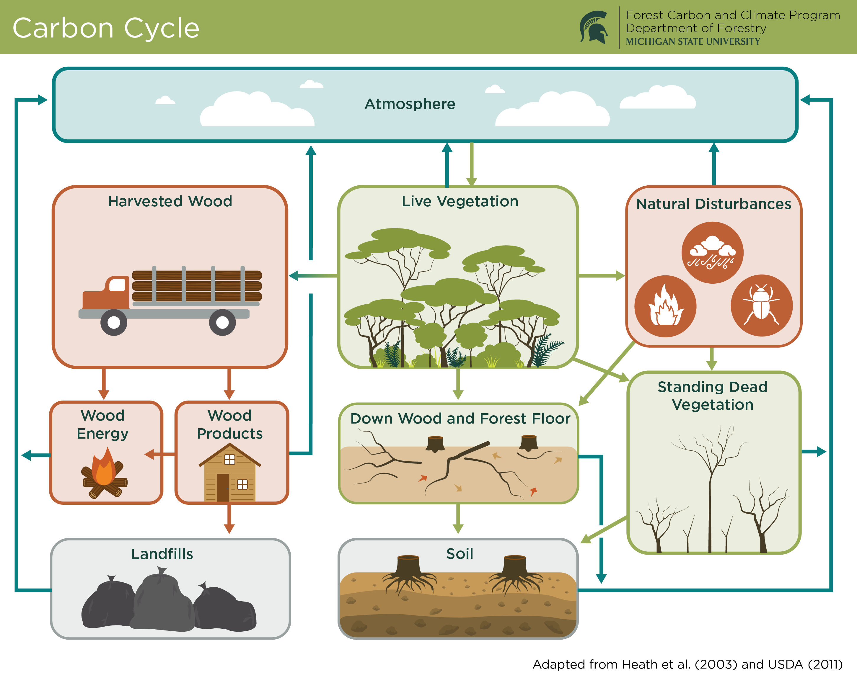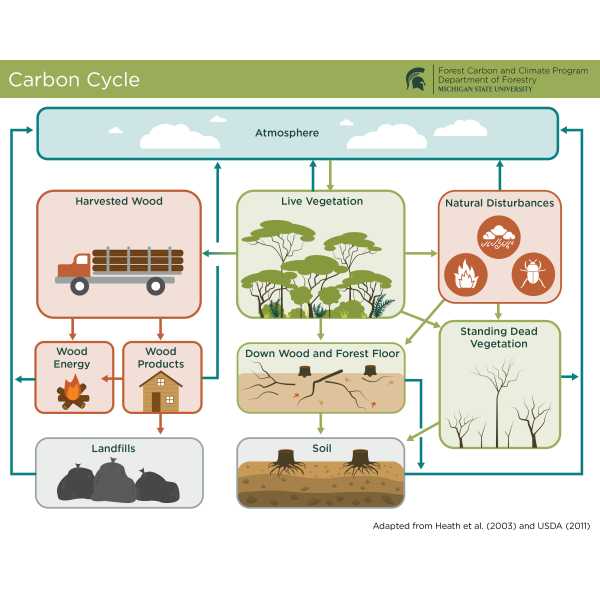 Carbon Cycle: A summary of the carbon cycle with various processes highlighted, including the transformation of live vegetation into harvested timber.