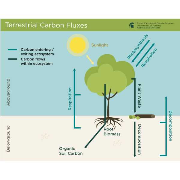 Terrestrial Carbon Fluxes: A diagram displaying above- and below-ground flows of carbon entering, moving within, and exiting a terrestrial ecosystem.