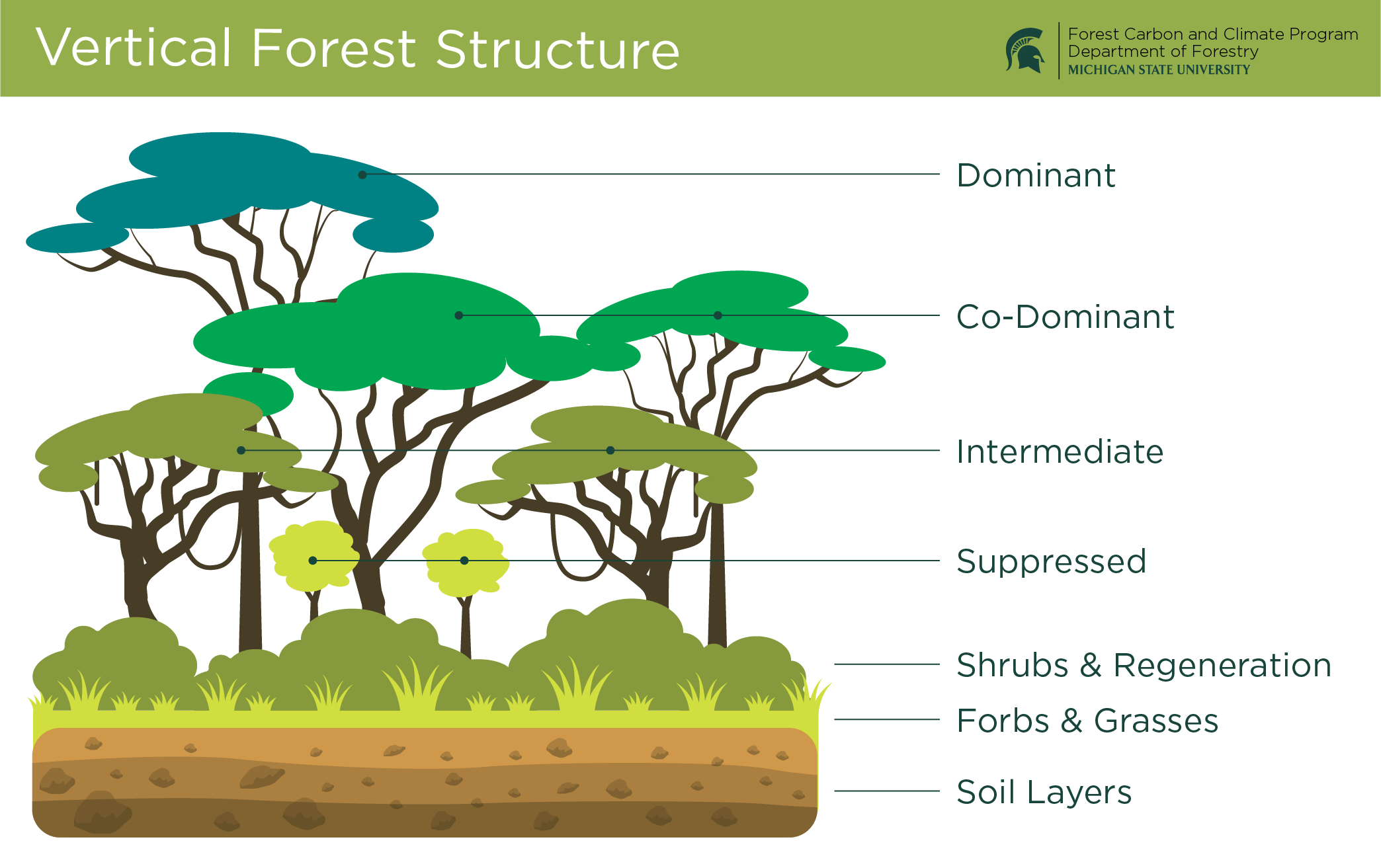 Vertical Forest Structure: An image highlighting the different levels and vertical structure of forests, from soil layers to dominant foliage.