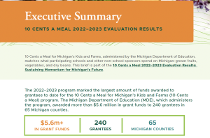 10 Cents a Meal is a state-funded program that aims to improve daily nutrition for Michigan school children and invest in the state's agriculture economy. This is the Executive Summary of the 2022-2023 evaluation report. -
