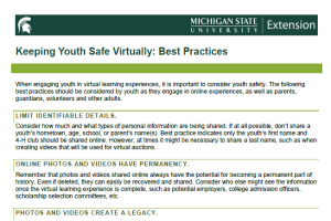 When engaging youth in virtual learning experiences, it is important to consider youth safety. These best practices should be considered by youth as they engage in online experiences, as well as parents, guardians, volunteers and other adults. -