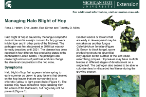 Halo blight of hop is caused by the fungus Diaporthe humulicola and is a major concern for hop growers in Michigan and in other parts of the Midwest. -