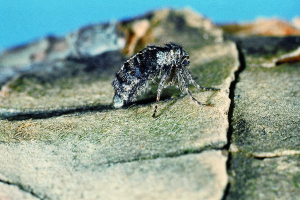 The adult is mottled grayish black and brown. Its head is prolonged into a large but short snout that bears antennae. Each elytron has a series of humps with the 2nd and 3rd pairs separated by a clear transverse band.