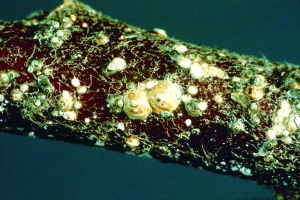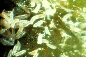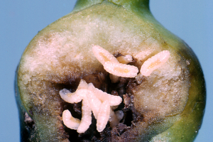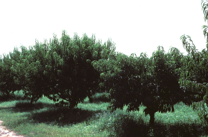 Root-lesion nematodes are microscopic, migratory endoparasites that feed on the root systems of many crops. Affected trees appear stunted, may exhibit chlorosis or yellowing of the leaves, and have poor yields; young trees may be killed.