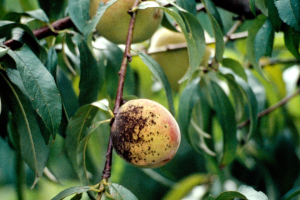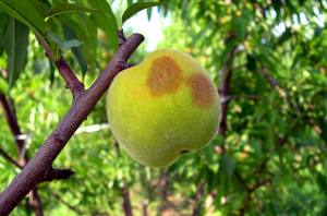 Lesions begin as small, circular, tan to orange blemishes approximately 3–5 mm in diameter. The discoloration is due to discoloring of the fuzz on the fruit.