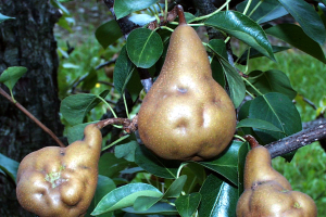 Dark-green spots appear on developing fruit about two to three weeks after petal fall. The tissue around the affected areas continues to grow, forming deep pits.