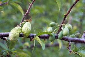 Plum rust mites (PRM) generally restrict their feeding to new foliage, causing these leaves to brown and roll upward longitudinally