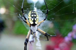 The body of a spider is divided into two regions, the cephalothorax and abdomen. The cephalothorax bears the eyes (various numbers and arrangements), mouthparts, pedipalps and legs (four pairs), and the unsegmented abdomen bears the genital structures, spiracles, anus and spinnerets (silk-spinning structures).