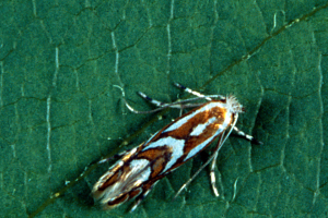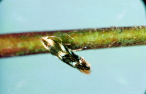 The adult is a tiny beige moth with heavily fringed wings striped with golden brown and white bands. Eggs are laid individually on the undersurface of the leaves.