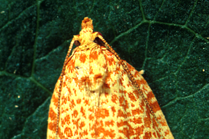 The adults of the skeletonizers are brown and short, with transverse bands on each forewing. The larvae are yellow to pale green with numerous hairy discs on each segment of the body.