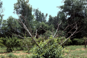 Trees in their third to sixth year show a sudden wilt and collapse of new blossoms and death of branches, with tree death following within weeks of initial symptoms. The bark of affected trees appears reddish and water-soaked and gum exuding from these tissues often has a "sour sap" odor.