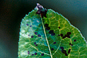 Lesions on leaves begin as pinpoint spots, enlarging and becoming velvety brown to olive green with indistinct margins. Older lesions may remain singular or coalesce with other leaf lesions; they eventually stop expanding and develop distinct margins.