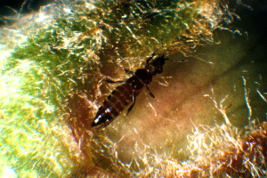 Feeding by thrips, particulary Frankliniella occidentalis, can cause scarring on fruit. During bloom, thrips feed on pollen and small berries.