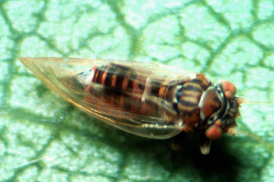 Adults are wedge-shaped, nearly black, with red eyes and red-orange wing veins. The clear wings are held tent-like over the body.