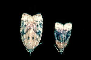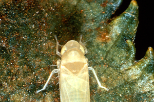 Adults are creamy white with short antennae, translucent wings, and a long wedge-shaped body. Usually found on the underside of leaves, they jump and fly with great agility. Nymphs are yellowish, wingless and very mobile; they generally move in a back-and-forth motion.