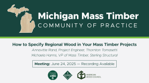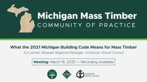 During this Michigan Mass Timber Community of Practice meeting, we have a presentation and conversation on what the 2021 Michigan building code means for mass timber, featuring expert Ed Lisinski, Midwest Regional Manager with American Wood Council. -