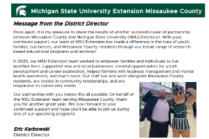 Michigan State University Extension is proud to serve people in Missaukee County with programs supporting youth, strong communities, healthy families, and our natural resources.