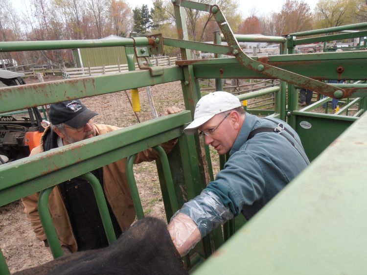 Likewise, blood from penetration through the rectum is another major pathway of disease transmission. Rectal palpation has been shown to cause minute amounts of bleeding a relatively high proportion of times. That blood, retained on a palpation sleeve that is then used in another animal can transfer the disease.