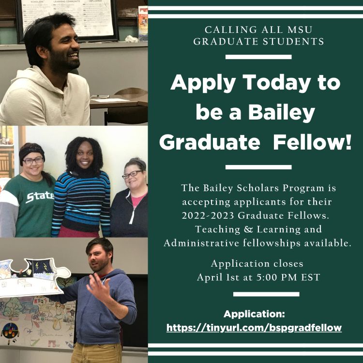 The Bailey Scholars Program is offering the opportunity for graduate students (Master’s and PhD) in any discipline to apply to be a Graduate Fellow with the program to further their development in the scholarship of teaching and learning. Please see the information below for further information about the fellowship. If you have any questions, please contact the Program Director, Jennifer (Jeno) Rivera (jeno@msu.edu). Please feel free to check out our website (https://www.canr.msu.edu/bsp/) for more information about the program in general.