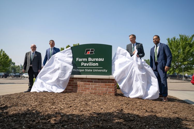 Leaders from the College of Agriculture and Natural Resources, MSU and Michigan Farm Bureau gathered on Tuesday, July 15, to unveil the newly re-named Farm Bureau Pavilion.