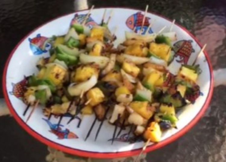 Prepare skewers, alternating green pepper, pineapple, and fish chunks.