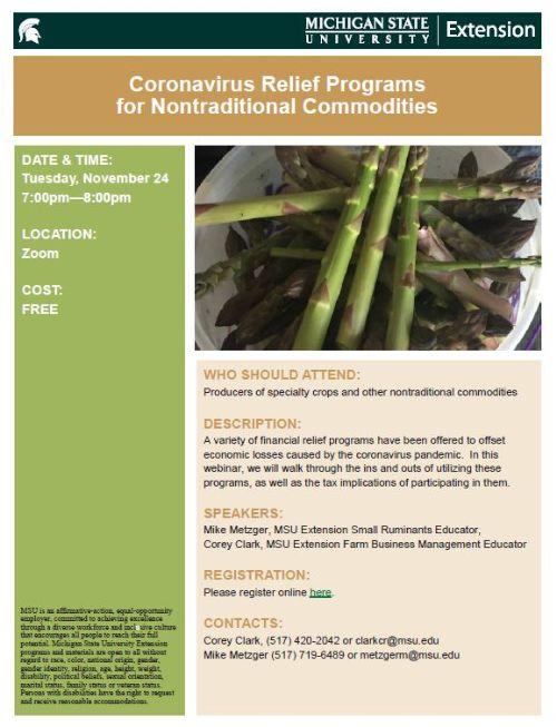 An online webinar, “Coronavirus Relief Programs for Nontraditional Commodities,” will be held on Tuesday, Nov. 24 from 7 p.m. to 8 p.m. Michigan State University Extension educators Corey Clark and Mike Metzger will provide further information about these programs in this webinar. A key focus will be on structure and eligibility requirements, and include the application process for the Coronavirus Food Assistance Program 2 as signup continues until Dec. 11. In addition, the tax implications of these programs will be addressed to help you better manage your tax planning and reporting.