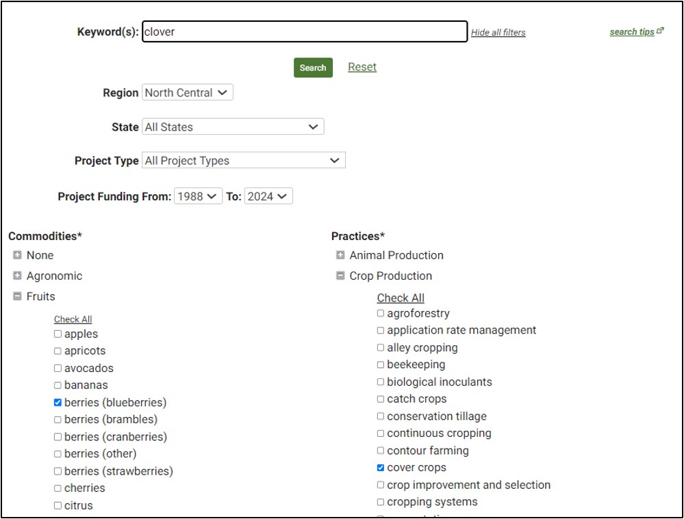 For example, I might be curious about using clover as a cover crop in blueberries and could run the following search: