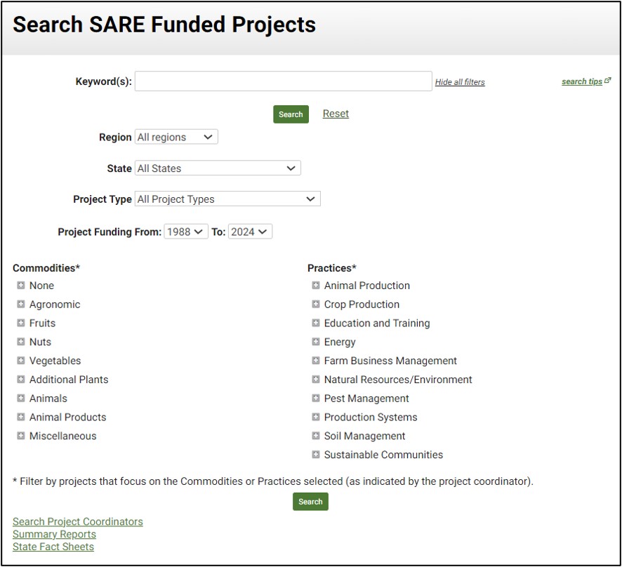 To search the SARE database, go to Search SARE Funded Projects as shown below: