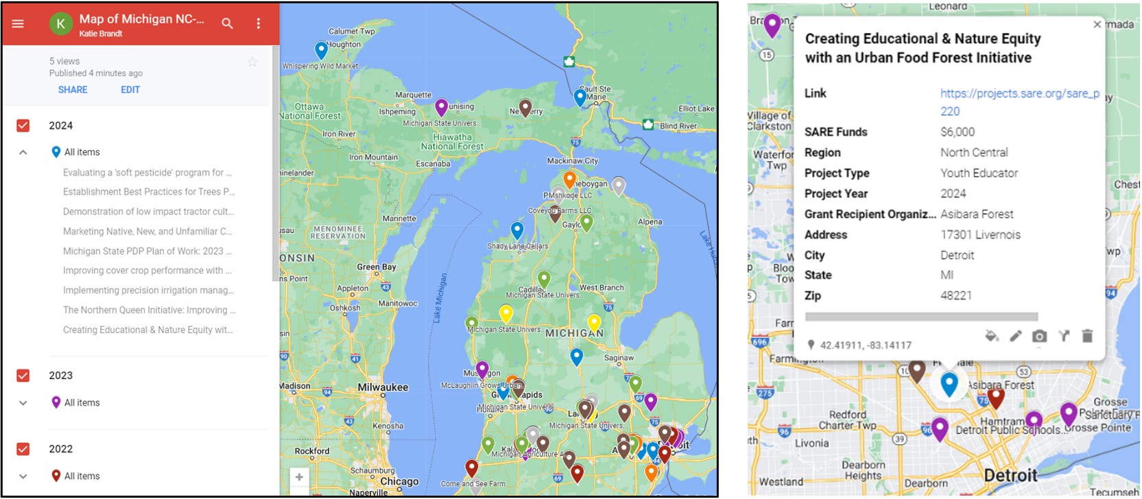 Please let us know if you have any questions or suggestions about the map, SARE grants or an innovative idea you would like to propose for SARE funding. You can contact state SARE coordinator Sarah Fronczak at froncza3@msu.edu or the map designer Katie Brandt at brandtk7@msu.edu.